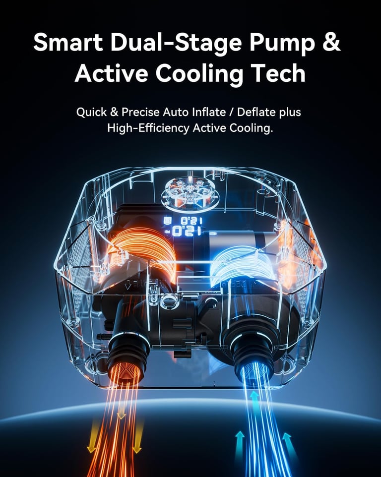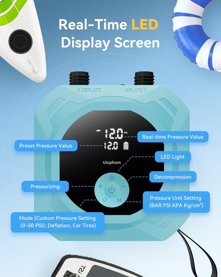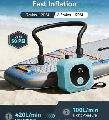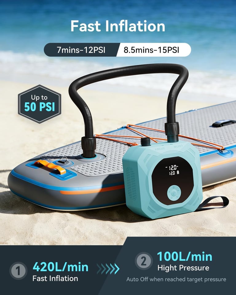 【Dual-Stage Tech & Auto-Off】 Enjoy fast inflation with dual-stage technology: 420 L/min for rapid volume filling, then 100 L/min for high-pressure precision. Get your SUP from flat to 12 PSI in under 7 minutes. Rechargeable air pump stops automatically at your preset pressure. Fast, accurate, worry-free.