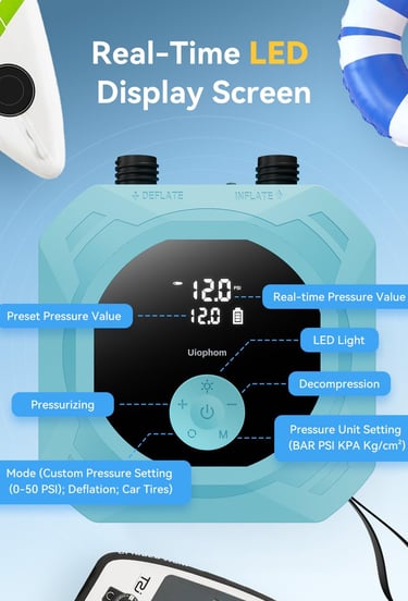 【Real-time LED Display】 The large LED screen displays both current and target pressure, keeping you fully informed of inflation progress. A built-in multifunctional light illuminates your workspace, making it easy to inflate even in dark or low-lightweight conditions.