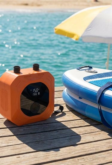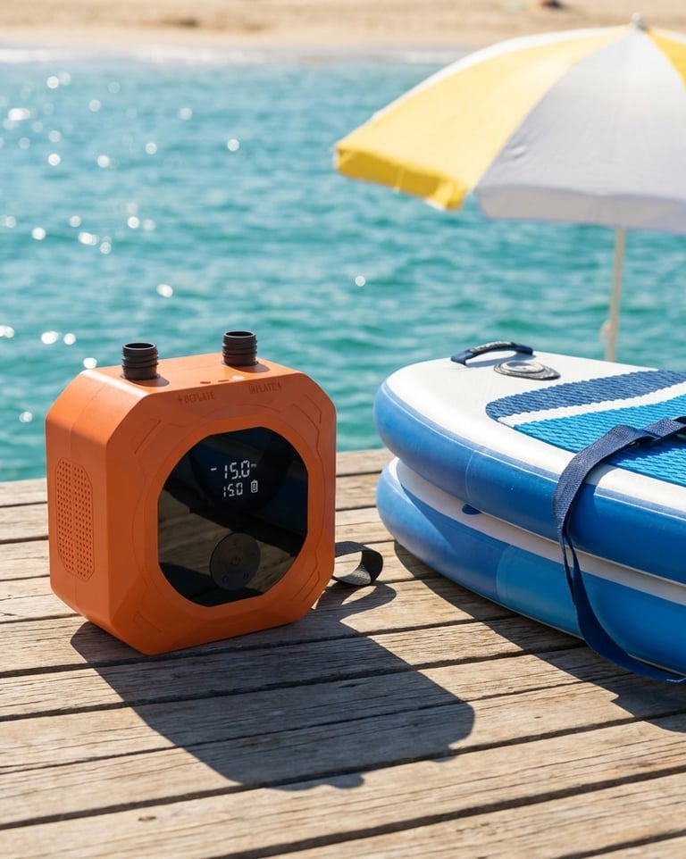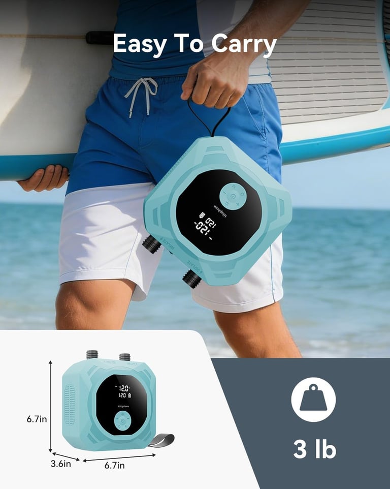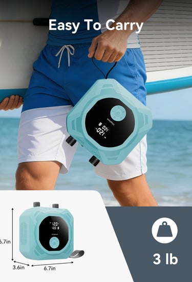 【Lightweight & Portable Design】 Weighing just 3 lb and measuring 6.7 × 3.6 × 6.7 inches, this paddle board electric pump features a built-in nylon handle for easy carrying. Compact and travel-ready, it comes with a storage bag to keep everything organized—ideal for daily use or outdoor adventures.