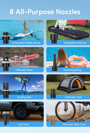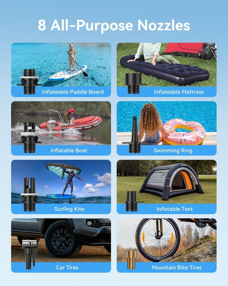 【Upgraded 50PSI Power 】This cordless paddle board pump delivers 50PSI to handle everything from SUPs to car tires, motorcycle tires, and mountain bike tires, plus air beds, boats, pool floats, tents—one pump replaces many.