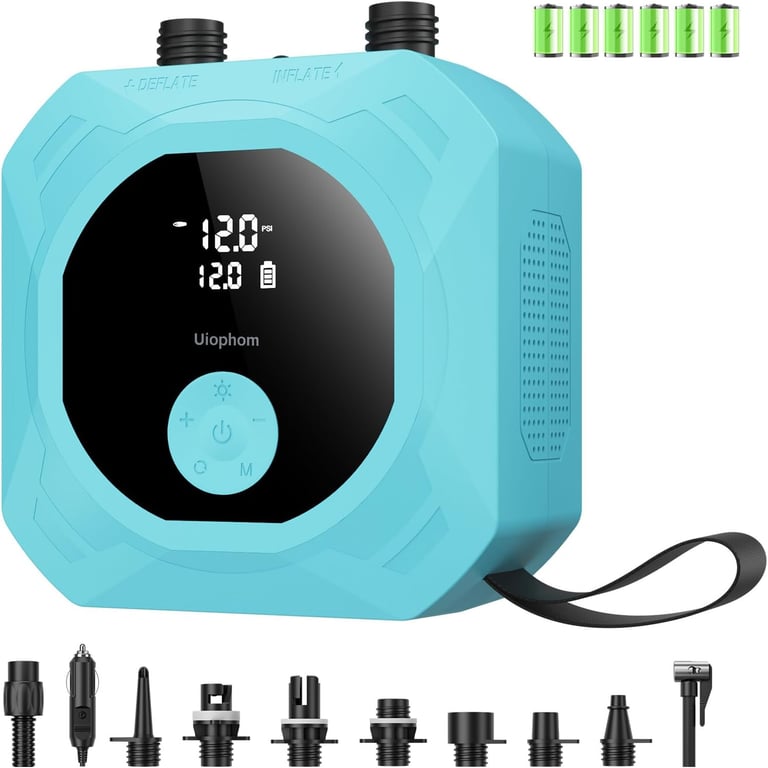 【Long-Lasting & Continuous Performance】Powered by 6×2000mAh batteries with 15W fast charging, this electric air pump inflates a 10.6ft SUP board up to 5 times (0-12 PSI) or 4 times (0-15 PSI) on a single charge—ideal for group outings and water sports. The active cooling system prevents overheating during extended use, while the 12V DC car connector offers convenient on-the-go power.