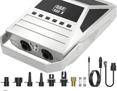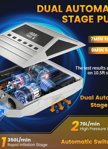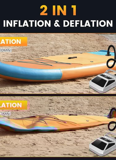 Equipped with an automatic dual-stage pump, delivering a maximum speed of 350L/min in the first stage and 70L/min in the second stage, ensuring fast and stable inflation for different inflatable items.