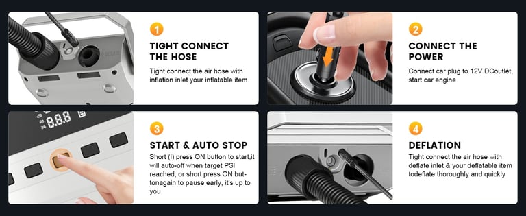 Application Scope: Inflation of SUPs, kayaks, air mattresses, swim rings, yoga balls, cars, motorcycles, bicycles, etc.