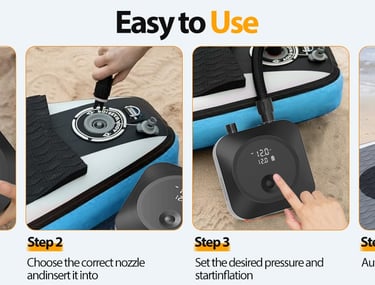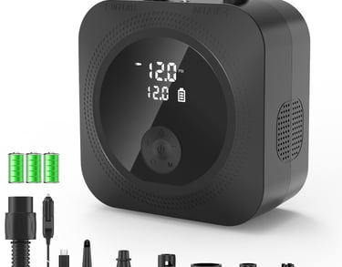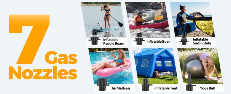 【What You Will Get】1x air pump, 1x air horse,2x fuse,7x air nozzles, 1x 30cm DC Car charger, 1x Type C charging cable, 1xuser manual, 1x tote bag, suitable for stand up inflatable paddle boards, inflatable beds, kayaks, tents, boats or swimming rings.
