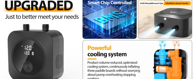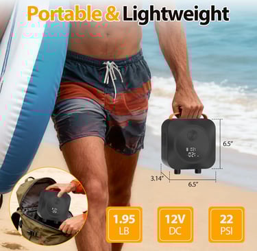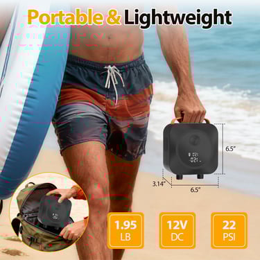 【Lightweight and Portable Design】Weight: 1065g(DC12V) 1210g(3x2500mAh battery); Size: (165*165*80mm), this sup pump comes with a built-in handle, making it portable and easy to carry.