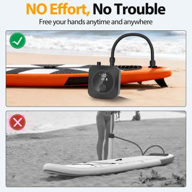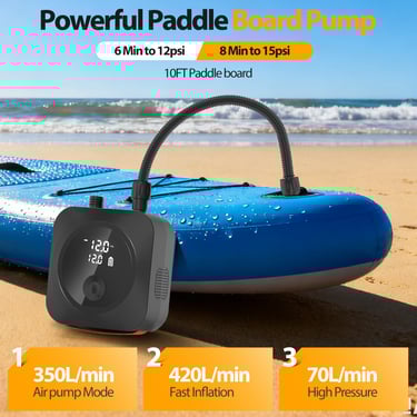 【Durable & Functional Build】The rechargeable paddle board pump is made of PC+ABS material, it includes an LED light (with SOS function) for low-light use. It supports 4 pressure units (PSI/BAR/KPA/KG/CM²) and has a pressure accuracy of ±1.5% (±2PSI).