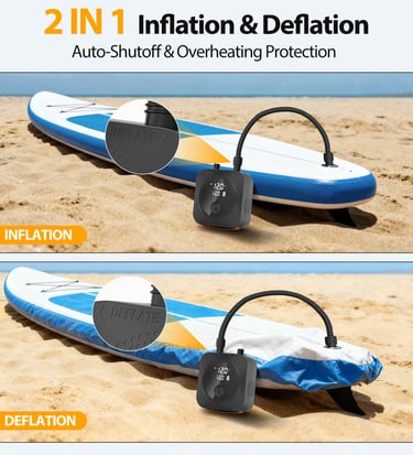 【Efficient Powerful Inflation & Deflation】With a maximum pressure of 22 PSI, it can inflate a 10.5 ft SUP board to 12 PSI in just 5 Mins, saving your time and quickly start the water adventerure. The deflation function helps you save effort when packing it up.