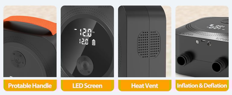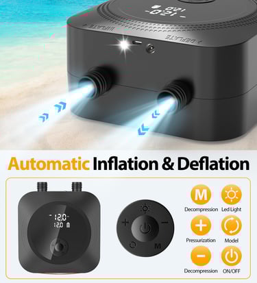 【Dual-Stage Pump & Multiple Modes】Equipped with an automatic dual-stage pump: 1st stage max speed 350L/min, 2nd stage max 70L/min. It offers 3 modes (Inflate/Deflate/DC) for versatile use. When reaching the preset value, the pump will automatically turn off so that you don't need to worry.