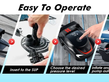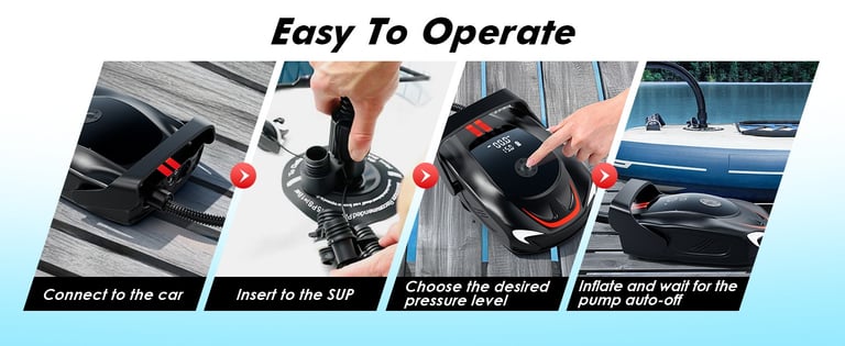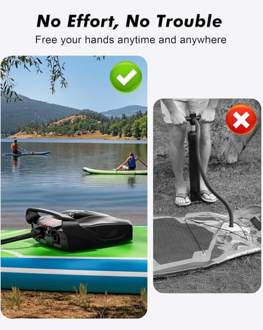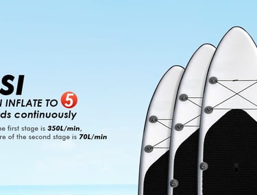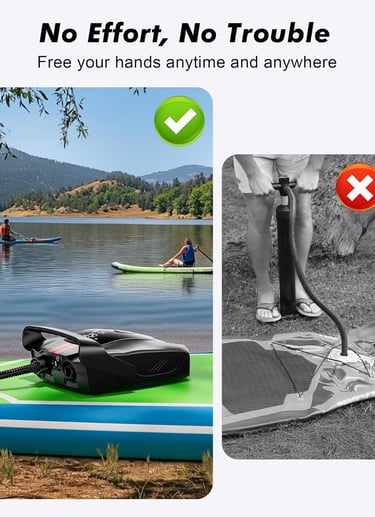 【FAST AND POWERFUL DUAL-LINE AUTOMATIC ENGINE】Experience a portable pump for inflatables with unmatched performance with a dual-line automatic engine lock function. The paddleboard pump's first level offers a maximum speed of 350L/min, while the second level delivers a powerful 70L/min, allowing you to achieve your goals and outperform competitors quickly.
