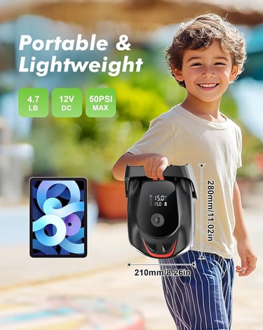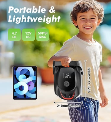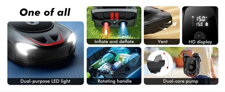 【UNIQUE DESIGN FOR CARRYING】The SUP electric paddle board pump is compact at 11.02" x 8.26" x 3.54" and weighs just 4.7 lbs, making it highly portable. Electric pump for inflatables equipped with two-way electric lights for nighttime use and emergency signal lights ensures safety and visibility in low-light conditions.