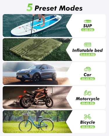 Modes: 5 modes (SUP mode, air mattress mode, car mode, motorcycle mode, bicycle mode)